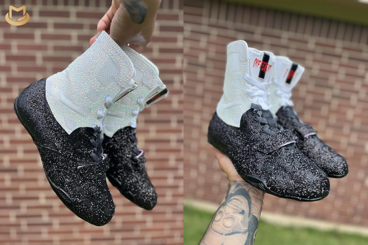 The shoes were designed by artist Aztek Kustoms with the idea of making them look like the famous loafers and sparkle socks.