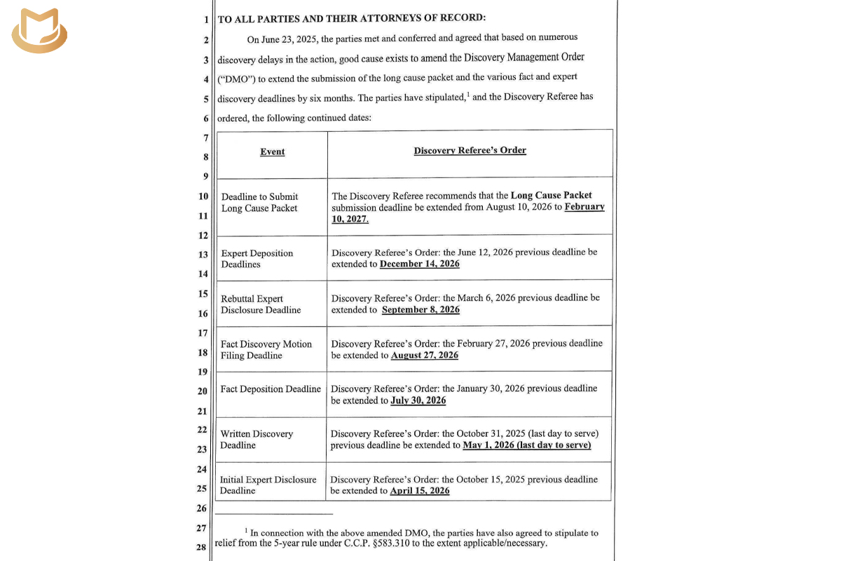 According to recent court filings, both the plaintiffs’ attorneys, the Estate’s legal team, and the appointed discovery referee have jointly agreed to extend all discovery deadlines by six months. The new proposed deadline is February 10, 2027. This comes amid a series of scheduling challenges and delays that have impacted the process on both sides.