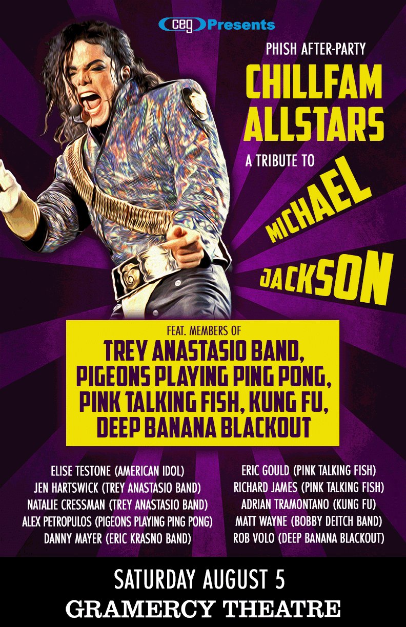 A lineup of jam scene performers will come together at the Gramercy Theatre in New York City late night on Saturday, August 5 for a show honoring the “King Of Pop.” ChillFam Allstars: A Tribute To Michael Jackson is one of many concerts surrounding Phish’s “Baker’s Dozen” residency at Madison Square Garden put on by promoter CEG Presents.