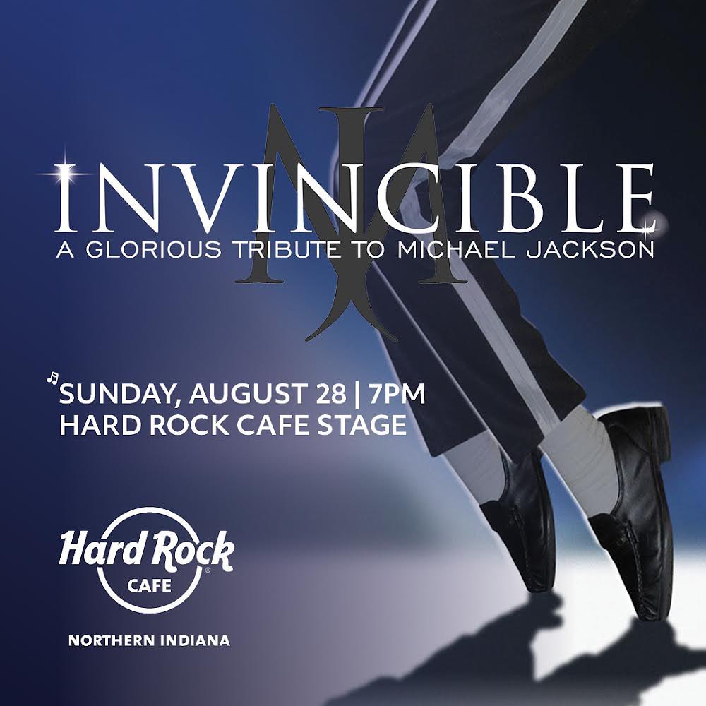Hard Rock Casino Northern Indiana: INVINCIBLE By Admin Team - August 18, 2022 0 785 Facebook Twitter Pinterest WhatsApp Date: August 28, 2022 Time: 7:00 pm - 9:00 pm Celebrate Michael Jackson’s birthday weekend at Hard Rock Cafe! Invincible: A Glorious Tribute to Michael Jackson will be on the HRC stage Sunday, August 28th at 7pm! — at Hard Rock Casino Northern Indiana