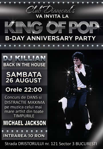 Daca esti fan, sau un simplu admirator al lui Michael Jackson… ia-ti palaria si pantofii de dans si vino la KING of POP – B-Day Anniversary Party