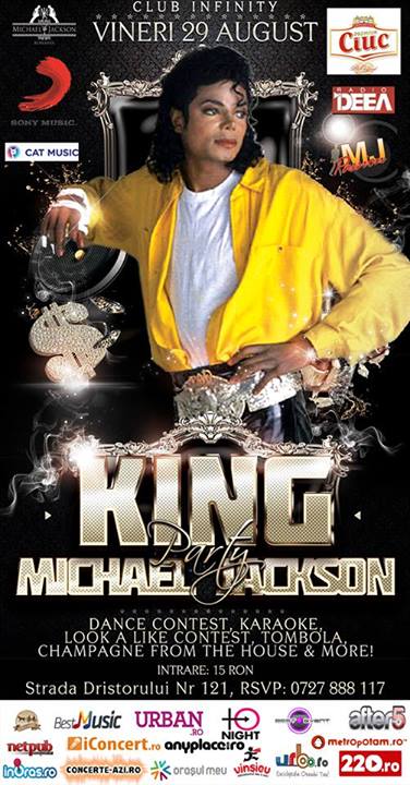 Michael Jackson Romania in parteneriat cu Sony Music, Cat Music, Ciuc, Radio Deea si Urban Fever va invita in data 29 AUGUST 2014 orele 21:00 la petrecerea fanilor Michael Jackson din Romania “TRIBUTE TO A KING PARTY”; ce va avea loc in Club Infinity din strada Dristorului 121, Bucuresti. Invitam toti fanii Michael Ja…ckson din Bucuresti si nu numai la o MEGA PETRECERE aniversara Michael Jackson! Ca de obicei nu vor lipsi concursurile de dans, karaoke, proiectie video, tombola cu premii si multi invitati surpriza!