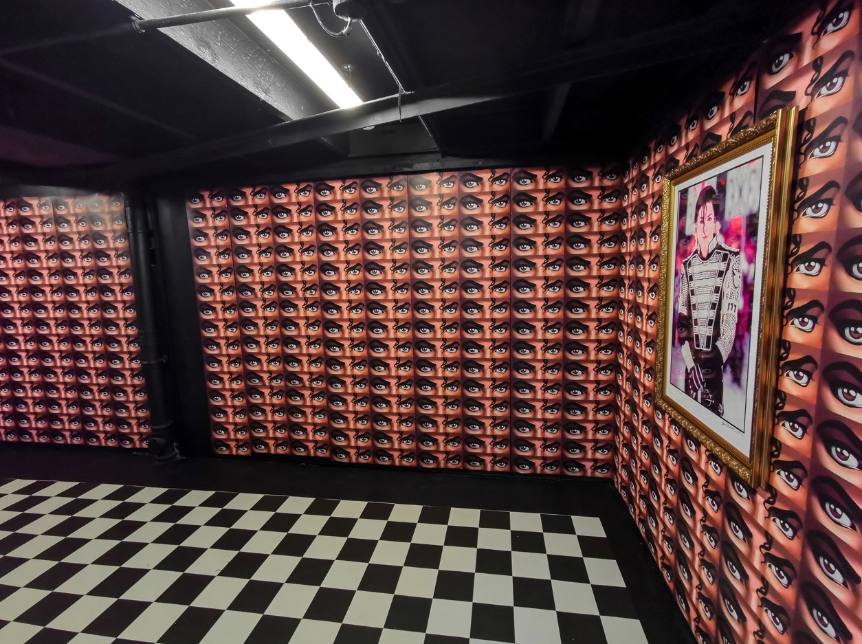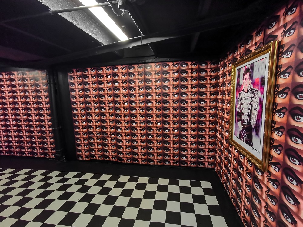 Repetition has been a key tool in my practice, and most obviously in my latest body of work: subject and image repetition, affecting both aesthetic and internal sensory experience. My 25 works are repetition of subject matter, meanwhile, I used repetition of the eyes from Jackson’s Dangerous (1992) album which I made the conscious decision to draw digitally due to the infinite possibilities of replication and repetition, for example: as it can be multiply printed, as printed paper materials such as concert tickets, newspaper articles are valuable to a fan. The sheer multitude of eyes covering the walls create a sense of being watched, resulting in perhaps notions of paranoia, triggering at the viewers instinctual reactions and behaviours, despite the viewer being the only one actively looking.