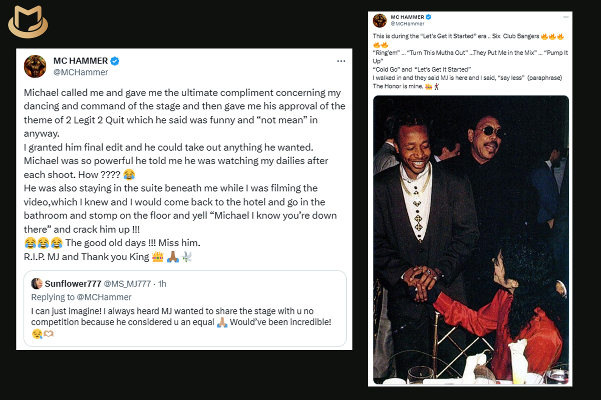 “Michael called me and gave me the ultimate compliment concerning my dancing and command of the stage and then gave me his approval of the theme of ‘2 Legit 2 Quit’ which he said was funny and “not mean” in anyway. I granted him final edit and he could take out anything he wanted. Michael was so powerful he told me he was watching my dailies after each shoot. How ???? He was also staying in the suite beneath me while I was filming the video,which I knew and I would come back to the hotel and go in the bathroom and stomp on the floor and yell “Michael I know you’re down there” and crack him up !!! The good old days !!! Miss him.”