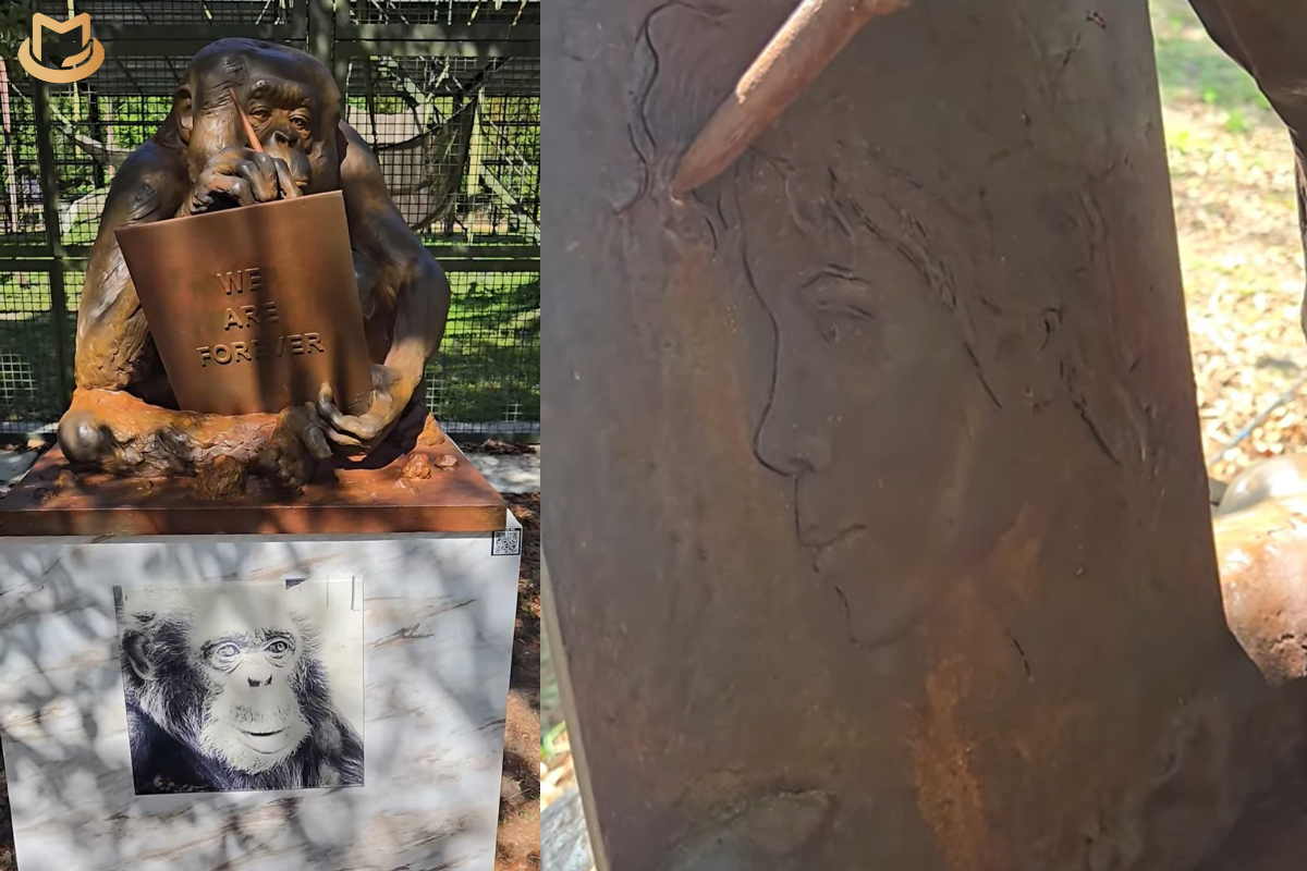 Set on a decorative plinth, the statue is surrounded by photographs chronicling Bubbles’ life, solo shots, images with Michael, and a list of the fan donors whose contributions made the project possible. It has been installed right outside Bubbles’ enclosure, where he continues to live a peaceful and enriched life among other rescued apes.