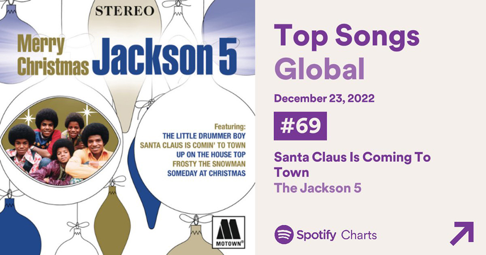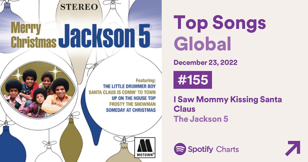 “I Saw Mommy Kissing Santa Claus” by the Jackson 5 has re-entered Spotify Global Charts with 1,342,053 streams while “Santa Claus Is Coming To Town” has earned 2,147,910 streams & moved up 24 spots