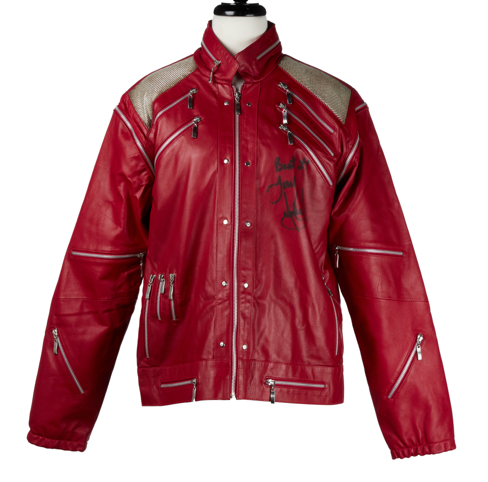 A Michael Jackson-signed red “Beat It” style leather jacket. The jacket is inscribed in black marker at left breast “Beat it! / Love / Michael Jackson.”