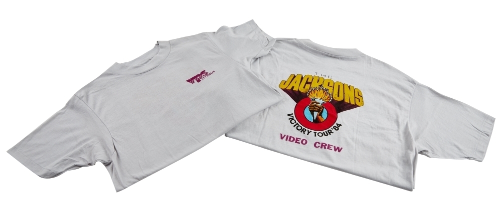 A group of two gray cotton blend T-shirts, both with text on the back reading, “The/ Jacksons/ Victory Tour ’84/ Video Crew.” One size “XL” and one size “M.”