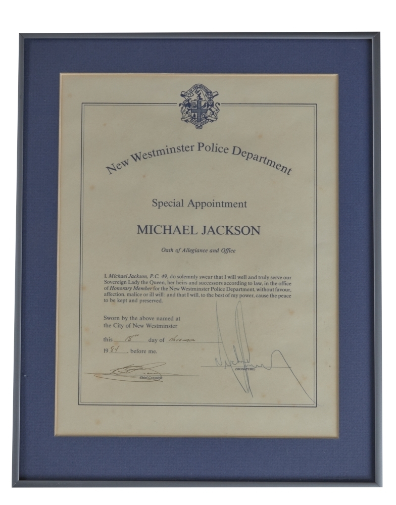 A framed certificate from the New Westminster Police Department appointing Michael Jackson as an honorary officer of the department on November 18, 1984.