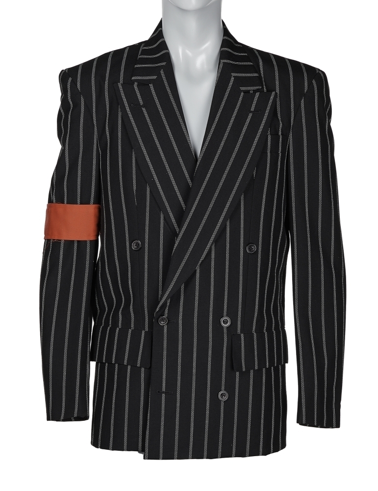 A black double-breasted blazer with white beaded stripes, worn by Michael Jackson in a 1988 photo alongside manager Frank DiLeo and Pee-Wee Herman. The wool-blendjacket, by Sullivan Suits, features three front pockets, two interior pockets, black buttons, and a red band around the right arm. No size present. Accompanied by a photo print of Jackson wearing the jacket.