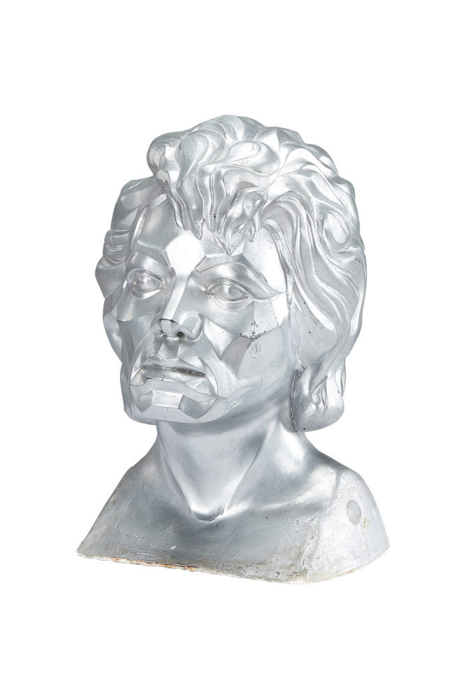 During the final transition of Michael Jackson’s character into a robot, this bust serves as a production-made model to show the design direction. The exterior is iridescent silver paint over a fiberglass and plaster body. The base features a wooden plug for support.