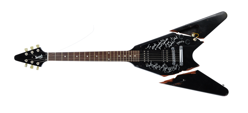 A custom made Gibson V-wing guitar smashed by Michael Jackson in the Mark Romanek directed video for the song “Scream,” from Michael Jackson’s 1995 album HIStory: Past, Present and Future, Book I.