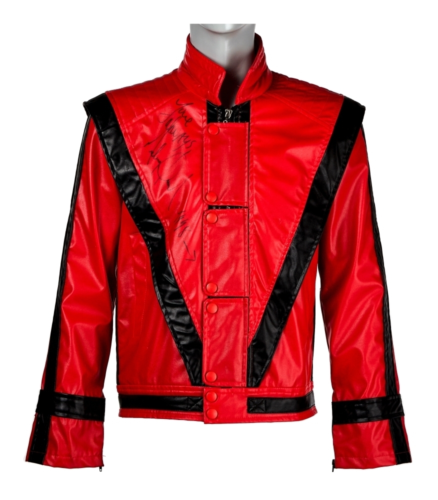 A red and black leather, commemorative Thriller” style jacket, signed and inscribed by Michael Jackson in black marker “Love Always, Michael Jackson 1998.”